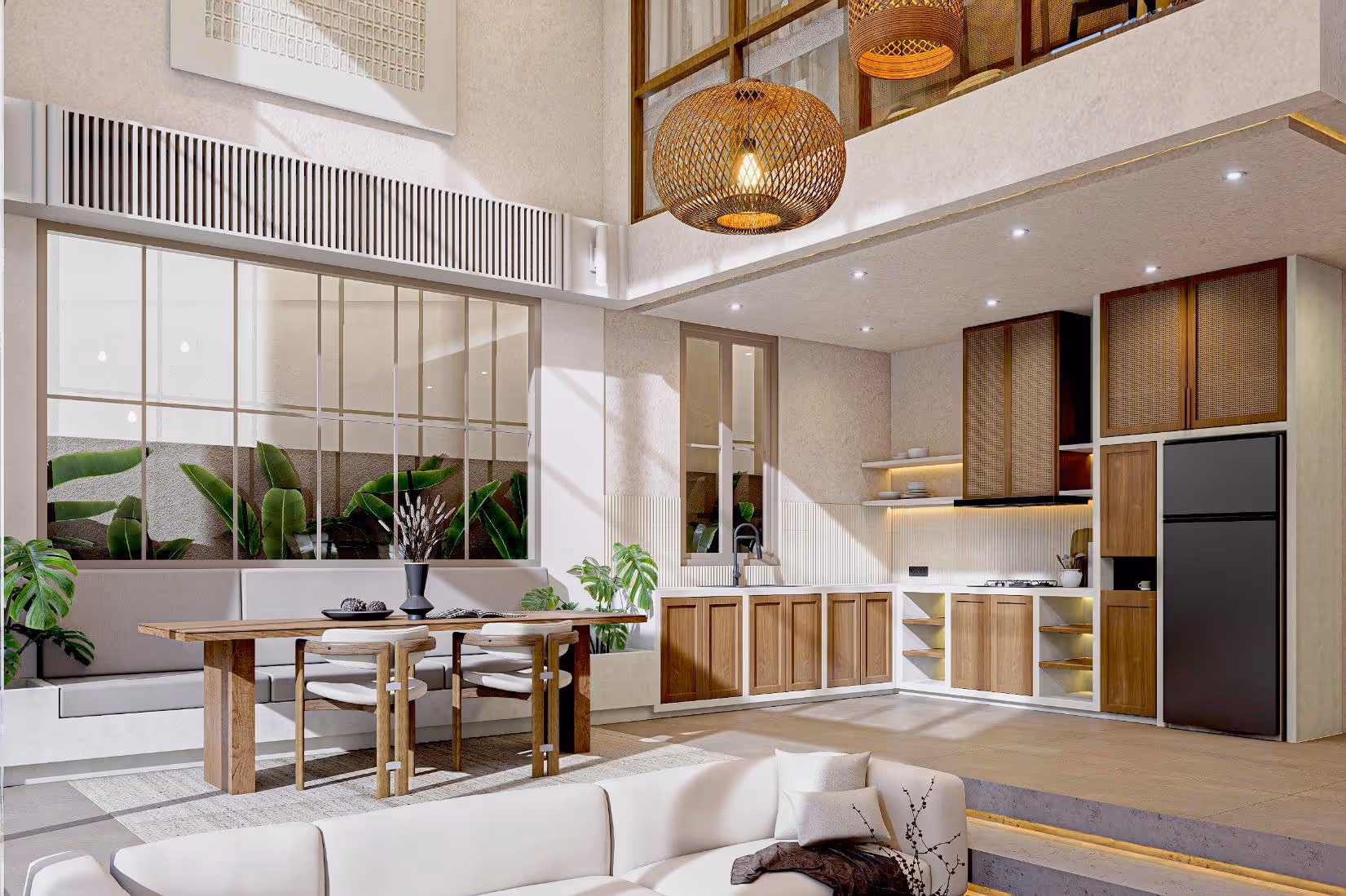 Inspired by Mediterranean architecture, the design incorporates arched forms, textured surfaces, and warm neutral tones that complement Bali’s natural surroundings. These architectural elements create a soft and elegant aesthetic while maintaining functionality for everyday tropical living.