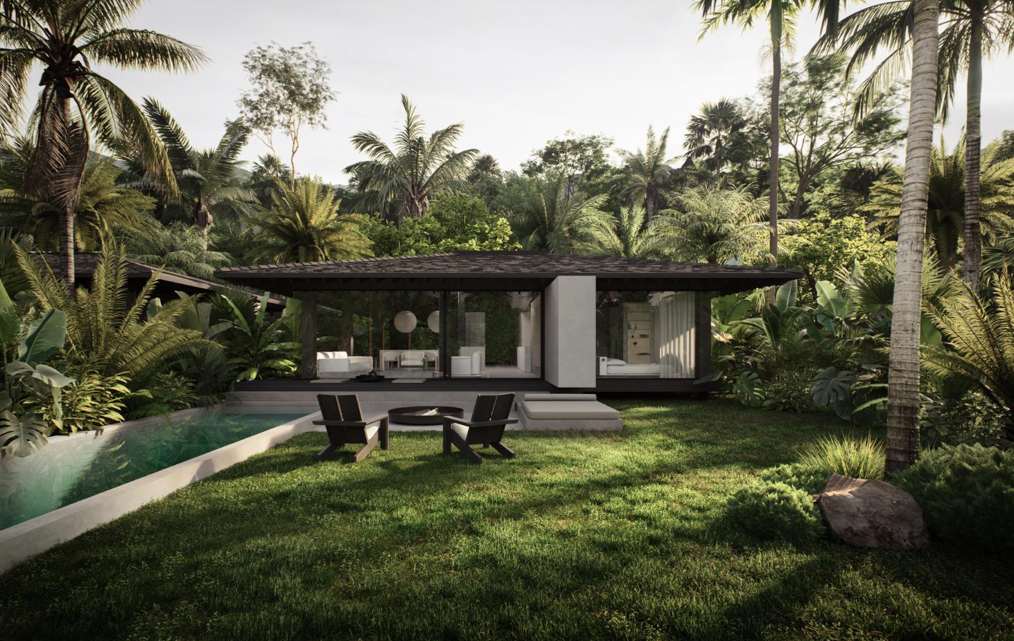 The villa sits on 110–120 m² of land with a total building size of 154 m², arranged over multiple levels. Inside, the layout includes two bedrooms and 2.5 bathrooms, with an enclosed living, dining, and kitchen area designed for year-round comfort. Large sliding doors connect the indoor space to a private swimming pool framed by greenery, while a rooftop level adds an additional lifestyle layer, ideal for relaxing, entertaining, or sunset views. The villa is delivered fully furnished, allowing for immediate usability upon completion in Q4 2026.